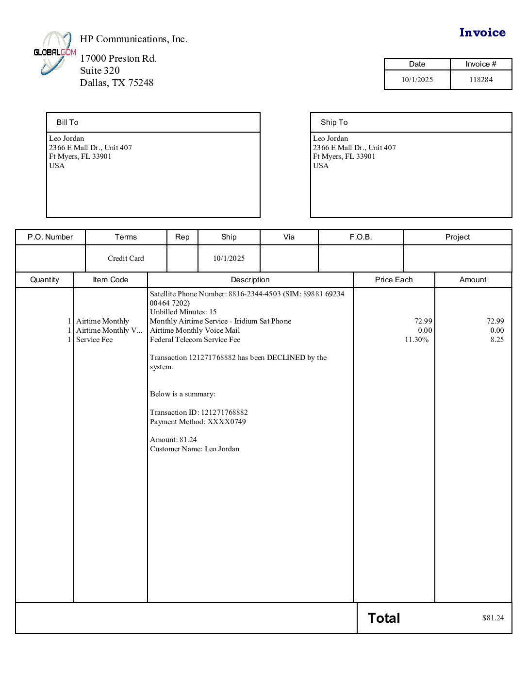 • Iridium Annual 15 Satellite Airtime Service Plan
